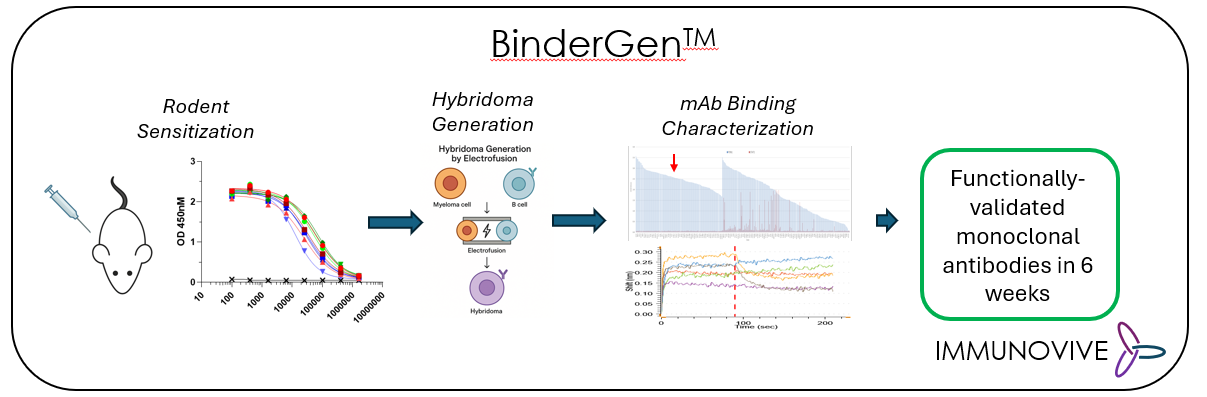 Our mission is to accelerate the discovery and development of immunotherapeutics. Our BinderGenᵀᴹ lead discovery platform generates diverse in vivo-matured monoclonal antibody target binders in 6 weeks designed to empower downstream preclinical drug development applications including target validation, proof-of-concept, lead optimization, multimodality engineering, and AI/ML datasets.